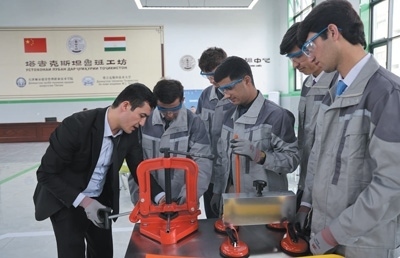 2022年,中亞地區(qū)首家魯班工坊在塔吉克斯坦啟動運營,為塔吉克斯坦開展職業(yè)培訓作出了積極貢獻。圖為今年4月,在塔吉克斯坦魯班工坊,塔方教授向?qū)W生介紹中方捐贈的設備。