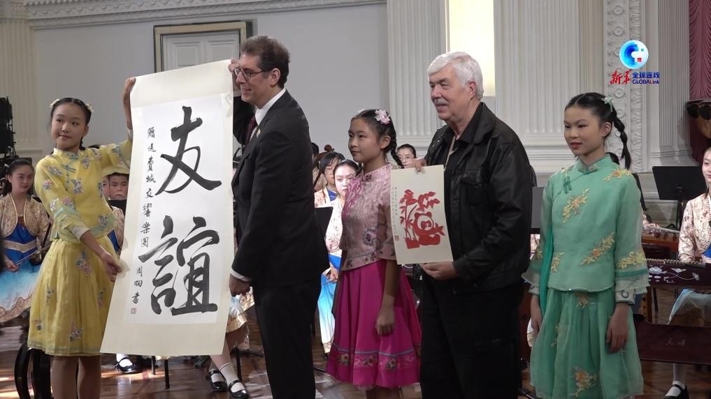 兩名少年兒童把在現(xiàn)場完成的寫有“友誼”二字的書法作品和以熊貓為主題的剪紙作品,作為禮品贈送給費(fèi)城交響樂團(tuán)。