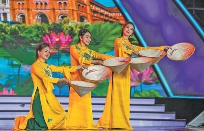 11月30日,2023年瀾滄江·湄公河流域國家文化藝術(shù)節(jié)開幕式暨文藝晚會在云南景洪市舉行。圖為來自越南的藝術(shù)工作者在表演舞蹈《斗笠舞》。新華社記者 胡 超攝