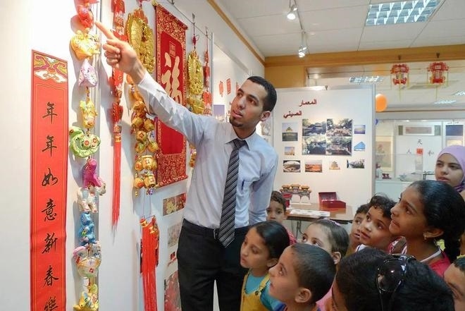 一位埃及青年正認(rèn)真向圍在身邊的學(xué)生們講解中國傳統(tǒng)文化中的十二生肖。他身穿白色襯衫,系著條紋領(lǐng)帶,學(xué)生們仰起頭,專心致志地聆聽講解。這位埃及青年便是時(shí)年28歲的阿巴斯。作為開羅中國文化中心主任助理,他經(jīng)常在這里向埃及學(xué)生和民眾介紹中國的文房四寶和京劇臉譜,講解中國的傳統(tǒng)節(jié)日和風(fēng)景名勝,并帶領(lǐng)孩子們做手工,燈籠、風(fēng)箏和寫對聯(lián)往往是他們最喜愛的內(nèi)容。在當(dāng)年埃及的動蕩時(shí)局下,中國文化中心照常對外開放,各種活動有序開展。首屆大使杯“魅力埃及,多彩中國”攝影大賽作品展就吸引了上百名開羅市民前往參觀。