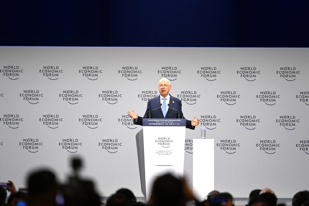 2023年6月27日,世界經(jīng)濟論壇主席施瓦布在第十四屆夏季達沃斯論壇開幕式上發(fā)言。新華社記者趙子碩攝