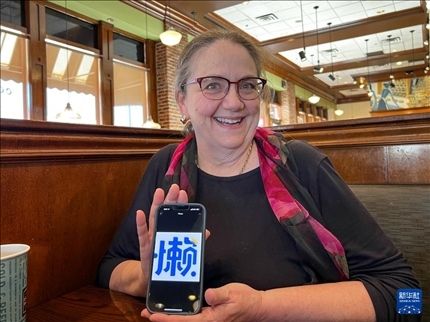 1月9日,在美國得克薩斯州達拉斯,朱麗葉·托馬斯用手機展示她的微信頭像“懶”字,意在提醒所有人監(jiān)督她學(xué)中文要勤奮,不要偷懶。新華社發(fā)(田丹攝)