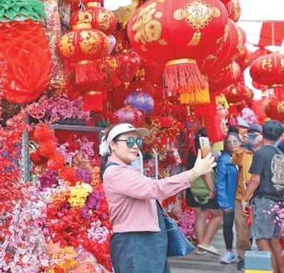 春節(jié)期間,印度尼西亞首都雅加達(dá)的中國(guó)城一派喜慶氣氛。圖為當(dāng)?shù)厥忻裨诮诌吷啼佔(zhàn)耘摹?/p>
