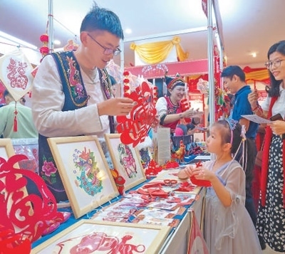 日前,在緬甸仰光舉辦的“歡樂(lè)春節(jié)·新春集市”活動(dòng)現(xiàn)場(chǎng),工作人員在展示剪紙作品。