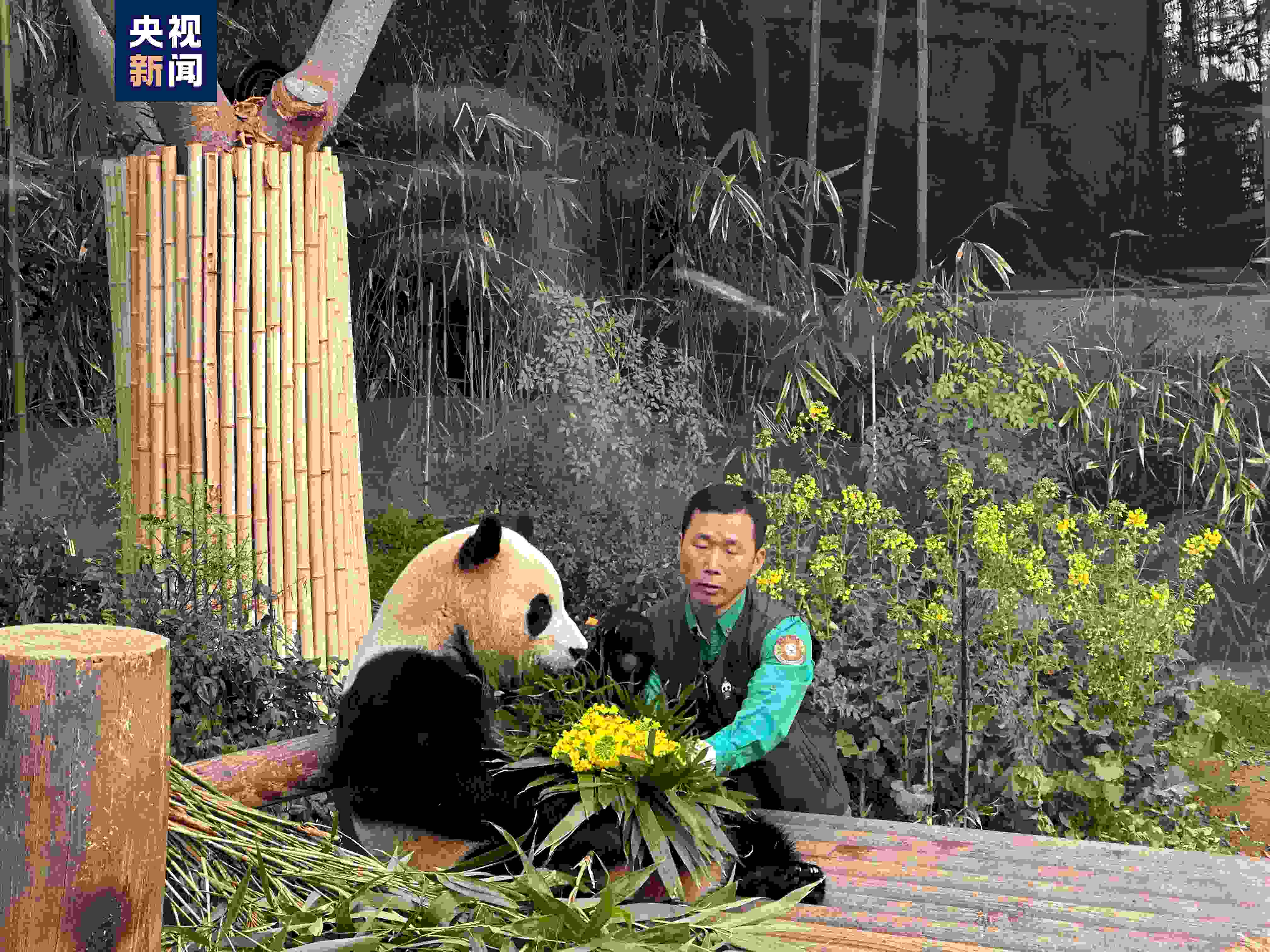 當(dāng)天,“福寶”的飼養(yǎng)員姜哲遠(yuǎn)、宋永寬為福寶準(zhǔn)備了愛(ài)心窩頭和竹子制作的“寶家族”全家福,還有寄托著兩位飼養(yǎng)員美好祝福的油菜花束,讓福寶最后一個(gè)與韓國(guó)觀眾見(jiàn)面的日子充滿了愛(ài)與祝福。