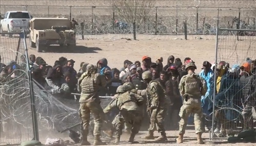 視頻畫面顯示,大批成年男性沖破州政府設置的鐵絲網(wǎng),將得州國民警衛(wèi)隊的一些士兵撞倒,并跑向邊界墻。 現(xiàn)場一片混亂,可以聽到有士兵對移民大叫“滾回去!”