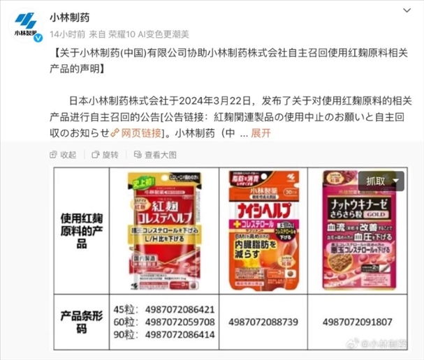 小林制藥生產(chǎn)的紅曲原料除供自家生產(chǎn)保健品外,還出售給其他公司用于釀酒及食品制造等。調(diào)查顯示,“意想不到”的成分存在于小林制藥2023年4月至12月期間生產(chǎn)保健品的原料中。目前使用小林制藥產(chǎn)紅曲原料的食品和調(diào)料召回范圍已擴大至日本全國。