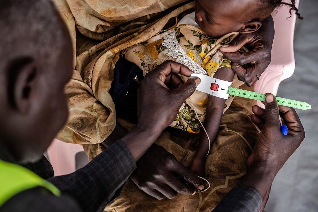 當地時間2024年2月13日,南蘇丹,在難民中轉中心的診所里,一名醫(yī)護工作人員在測量一名蘇丹兒童的手臂周長。