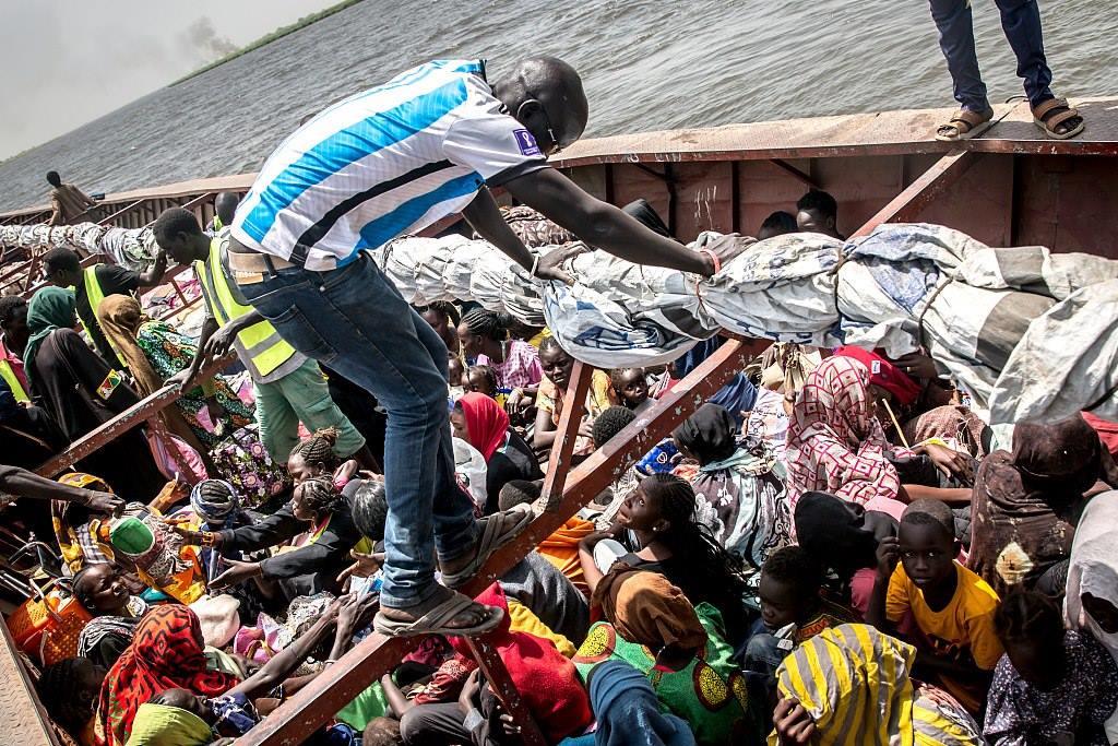 當地時間2024年3月21日,人們坐上船只抵達南蘇丹,逃離沖突。