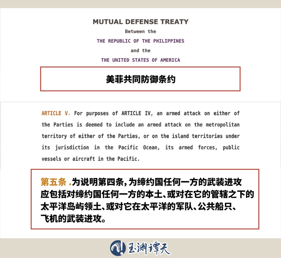 “……該條約延伸到在太平洋(包括南海任何地方)對菲律賓武裝部隊(duì)、公共船只或飛機(jī)(包括其海岸警衛(wèi)隊(duì)的船只或飛機(jī))的武裝攻擊……”