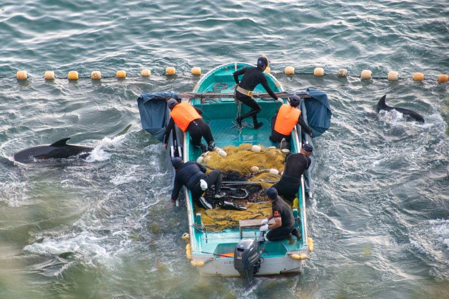 2023年,漁民在太地町追逐被趕入“海灣”的海豚。圖源:Robert Gilhooly