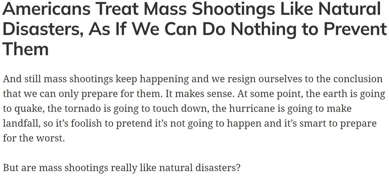 有美媒稱,對于一起又一起槍擊事件,如今的美國只是進(jìn)行數(shù)字的統(tǒng)計(jì),卻無力采取行動(dòng)改變現(xiàn)狀,似乎在美國人眼里,槍支暴力已經(jīng)成為像洪水、颶風(fēng)、野火一樣的“天災(zāi)”,而不是可以預(yù)防的人禍。