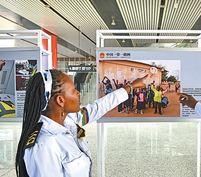 3月22日,在肯尼亞首都內羅畢,當?shù)厝嗽诿蓛辱F路內羅畢火車站參觀中非共建“一帶一路”務實合作圖片展。新華社記者 韓 旭攝