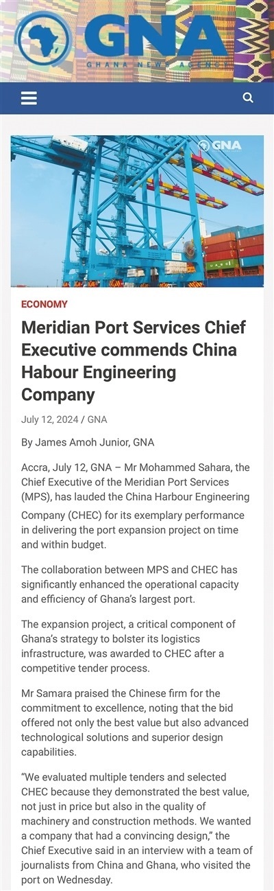 中國港灣為港口擴(kuò)建項(xiàng)目提供了先進(jìn)的技術(shù)解決方案和卓越的設(shè)計(jì)能力,并引入了多項(xiàng)創(chuàng)新技術(shù),包括能夠減少港口擁堵的停泊位窗口計(jì)劃,以及用于跟蹤和管理貨運(yùn)的先進(jìn)數(shù)字系統(tǒng),贏得了港口業(yè)主加納子午線港口服務(wù)有限公司高度肯定?!约蛹{通訊社報(bào)道