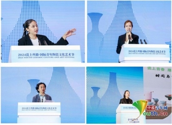 在主題演講環(huán)節(jié),四名陶瓷藝術領域青年藝術家代表分別上臺做了分享。土耳其青年藝術家佩琳因?qū)μ沾晌幕纳詈衽d趣而來到景德鎮(zhèn),她分享了自己對陶瓷文化的思考與理解,她認為“陶瓷藝術飽含著人們對文化多樣性繁榮發(fā)展、美美與共的美好期許”。韓國青年藝術家宋耎姝以自己的作品《銀之海》為例,和大家分享了創(chuàng)作感悟,她認為“陶瓷藝術創(chuàng)作應當關注人與自然的和諧關系,從大自然中汲取養(yǎng)分”。第十二屆全國青聯(lián)委員、江西省青聯(lián)副主席、國家級技能大師工作室領辦人歐陽敏致力于陶瓷文化的傳播,他在分享中強調(diào),“陶瓷文化是中華文明與世界文明交流互鑒的橋梁和載體。各國青年應當做文化傳承創(chuàng)新的踐行者,充分挖掘各國歷史文化的獨特魅力和時代價值,把傳統(tǒng)文化與潮流文化融匯在陶瓷藝術的創(chuàng)作中,為共同推動人類文明發(fā)展進步貢獻青春力量?!本暗骆?zhèn)學院陶瓷美術與設計藝術學院院長張博以《陶瓷藝術在空間中的應用》為題,分享了陶瓷文化所代表的中華傳統(tǒng)文化如何與當代潮流文化相結合,共同繪制出一幅幅五彩斑斕的人類文明畫卷。