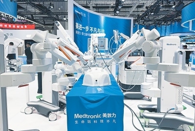 在進(jìn)博會醫(yī)療器械及醫(yī)藥保健館,美敦力展示的Hugo RAS機(jī)器人輔助手術(shù)系統(tǒng)。本報記者 高 喬攝