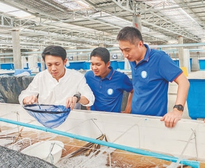 在柬埔寨干丹省一處羅氏沼蝦育苗場,上海海洋大學(xué)柬埔寨稻漁項目組成員指導(dǎo)當(dāng)?shù)毓ぷ魅藛T進(jìn)行苗種培育。