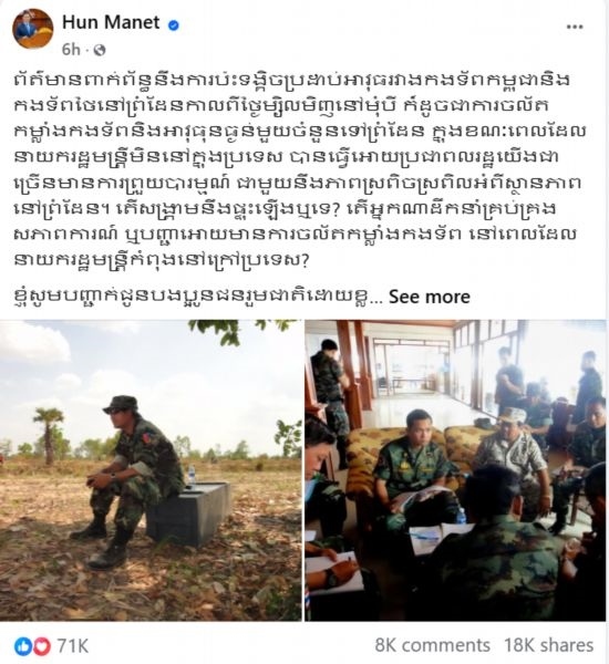 洪瑪奈在社交媒體上發(fā)文說,“我希望柬泰兩國陸軍高層今天的會談能夠取得積極成果,一如既往地保持雙方前線部隊(duì)間的和平與良好溝通”。
