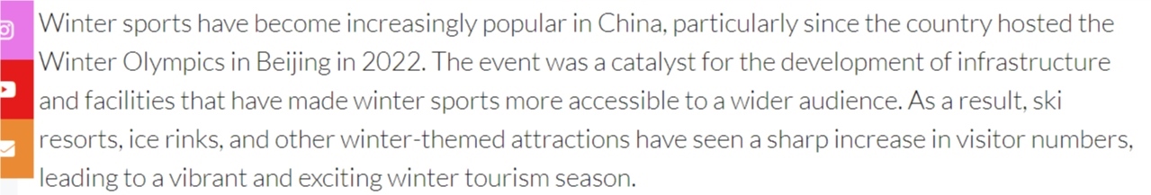 文章說,自2022年北京冬奧會成功舉辦以來,冰雪運(yùn)動在中國越來越受歡迎。冬奧效應(yīng)帶動了基礎(chǔ)設(shè)施的完善,讓更多人得以接觸冰雪項(xiàng)目。如今,滑雪場、冰場和其他冬季主題景點(diǎn)客流量大幅增長,造就了充滿活力、令人興奮的冰雪旅游季。