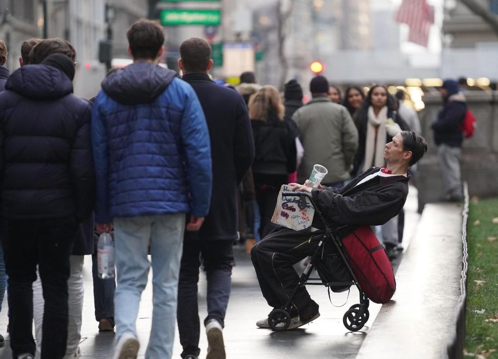 12月18日,一名男子在美國(guó)紐約曼哈頓街頭尋求救助。新華社記者張鳳國(guó)攝