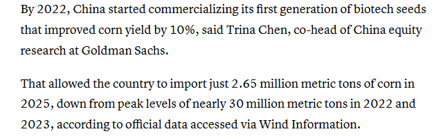 報(bào)道還稱,中國在農(nóng)業(yè)研究與開發(fā)方面投入巨大,2019年至2021年其公共部門在這方面的支出大約是美國的兩倍。報(bào)道援引高盛中國股票研究部聯(lián)席主管的觀點(diǎn)稱,到2022年,中國已開始將第一代生物育種產(chǎn)業(yè)化應(yīng)用,這些種子使玉米產(chǎn)量提高了10%。報(bào)道還援引萬得資訊獲得的官方數(shù)據(jù)稱,這使得中國在2025年的玉米進(jìn)口量?jī)H為265萬噸,遠(yuǎn)低于2022年和2023年近3000萬噸的峰值水平。
