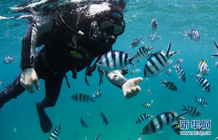 在海南三亞蜈支洲島海域拍攝的與??采男〕篝~(yú)(5月28日攝)。海南省三亞蜈支洲島海域海洋牧場(chǎng)是海南首個(gè)國(guó)家級(jí)海洋牧場(chǎng)示范區(qū),也是中國(guó)第一個(gè)位于熱帶地區(qū)的海洋牧場(chǎng)。近年來(lái),蜈支洲島海域海洋牧場(chǎng)推進(jìn)海洋生態(tài)系統(tǒng)的恢復(fù)和保護(hù),先后開(kāi)展了人工魚(yú)礁投放、海洋環(huán)境修復(fù)、珊瑚移植等工作。截至2019年底,蜈支洲島海域海洋牧場(chǎng)共投放各類(lèi)人工魚(yú)礁1526塊、船礁21艘和一批火山石礁,共達(dá)4萬(wàn)空立方米,礁區(qū)海域的漁業(yè)資源比非礁區(qū)要高5倍以上。目前,蜈支洲島海域海洋牧場(chǎng)已初現(xiàn)雛形。新華社記者楊冠宇攝
