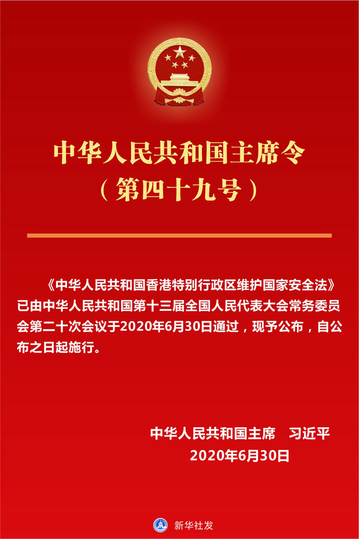 《中華人民共和國(guó)香港特別行政區(qū)維護(hù)國(guó)家安全法》已由中華人民共和國(guó)第十三屆全國(guó)人民代表大會(huì)常務(wù)委員會(huì)第二十次會(huì)議于2020年6月30日通過(guò),現(xiàn)予公布,自公布之日起施行。