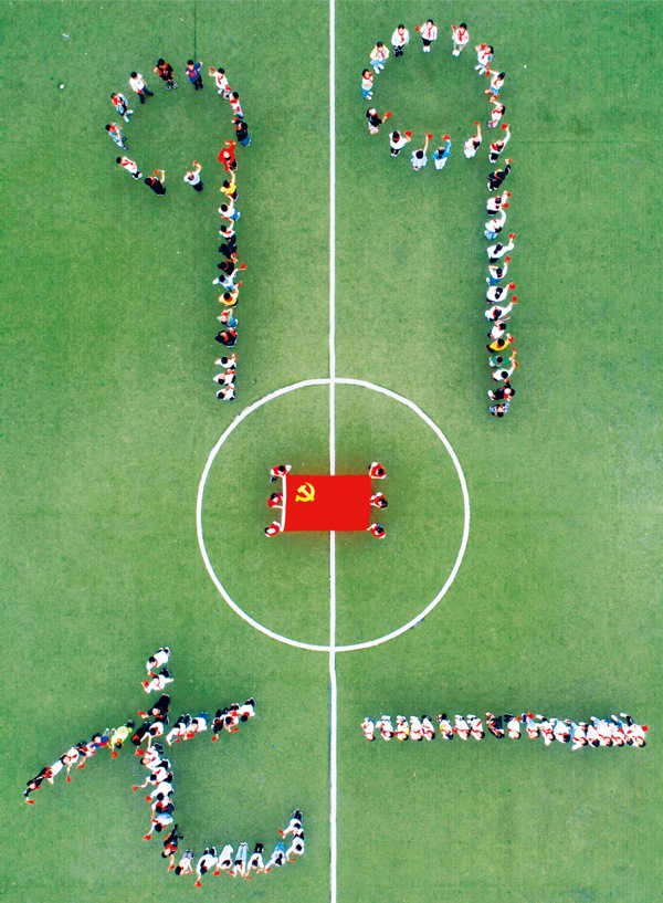2020年6月30日,江蘇省泰州市大馮中心小學開展“童心向黨迎七一”主題班會,通過給學生上黨課、講黨史等方式,讓學生了解黨的光輝歷程,迎接中國共產黨建黨99周年。圖為活動中擺出的“七一”、“99”和黨旗的組合圖案。中新社發(fā)湯德宏/攝
