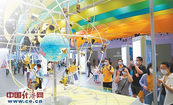 9月5日,觀眾在2020服貿(mào)會(huì)綜合展區(qū)觀看北斗衛(wèi)星模型。經(jīng)濟(jì)日?qǐng)?bào)-中國(guó)經(jīng)濟(jì)網(wǎng)記者趙晶攝