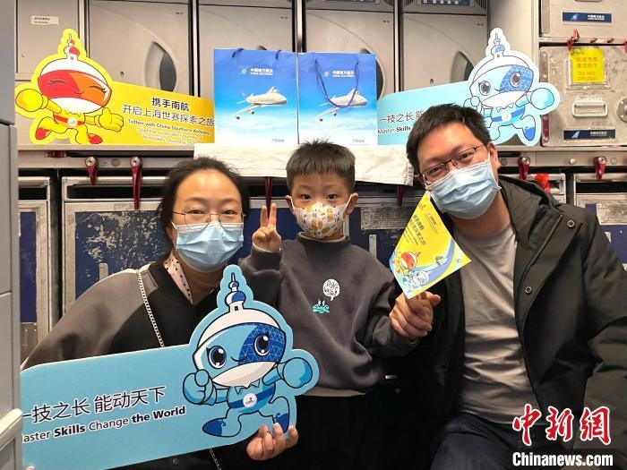 參加全球首架世界技能大賽主題彩繪飛機(jī)首航的乘客在機(jī)上留影 南方航空供圖
