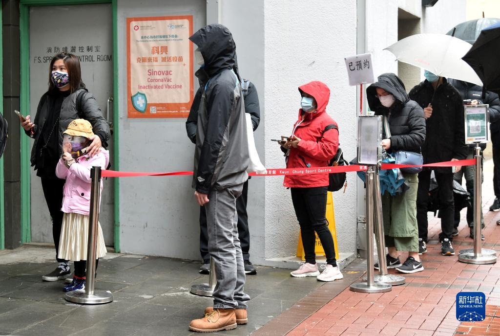 2月22日,在香港佐敦疫苗接種中心站,市民佩戴口罩排隊接種疫苗。新華社記者 盧炳輝 攝