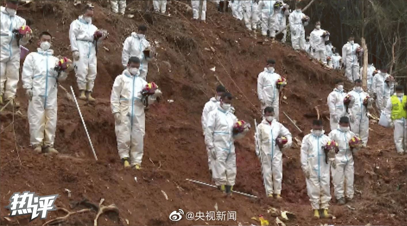 3月27日下午,“3·21”東航MU5735航空器飛行事故遇難者集體哀悼活動在事發(fā)地搜救現(xiàn)場舉行。全場鳴笛,國家應(yīng)急處置指揮部全體人員、事故現(xiàn)場搜救人員等面向遇難飛機(jī)方向肅穆而立,默哀三分鐘,以此寄托對遇難者的哀思。