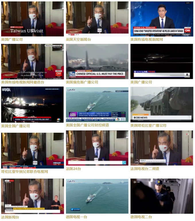 總臺(tái)國(guó)際視頻通訊社聚焦外交部、國(guó)臺(tái)辦、東部戰(zhàn)區(qū)等權(quán)威表態(tài),可視化制作編發(fā)《國(guó)際銳評(píng)》《玉淵譚天》等相關(guān)評(píng)論言論。截至8月4日10時(shí),共有84條新聞素材得到BBC、CNN、CNBC、英國(guó)天空新聞臺(tái)、法國(guó)24臺(tái)、法國(guó)電視臺(tái)、法國(guó)新聞臺(tái)、德國(guó)電視一臺(tái)、德國(guó)電視二臺(tái)、德國(guó)之聲、意大利廣播電視公司、意大利TGCOM24電視臺(tái)、加拿大廣播公司、加拿大最大的商業(yè)電視網(wǎng)CTV、俄羅斯第一頻道、全俄國(guó)家電視廣播公司、日本NHK、韓國(guó)KBS、巴西環(huán)球電視臺(tái)、印度國(guó)家電視臺(tái)、新加坡亞洲新聞臺(tái)、澳大利亞廣播公司、卡塔爾半島電視臺(tái)、墨西哥阿茲特克電視臺(tái)、印尼國(guó)家廣播電視臺(tái)等102個(gè)國(guó)家和地區(qū)的1683個(gè)電視臺(tái)及新媒體平臺(tái)采用。國(guó)際視頻通訊社還特別面向中國(guó)臺(tái)灣地區(qū)的媒體進(jìn)行精準(zhǔn)投送,實(shí)現(xiàn)臺(tái)灣地區(qū)主流電視臺(tái)全覆蓋,落地效果突出:臺(tái)灣東森電視臺(tái)、臺(tái)灣無(wú)線衛(wèi)星電視臺(tái)(TVBS)、臺(tái)灣中華電視臺(tái)、臺(tái)灣中天電視臺(tái)等共有13個(gè)臺(tái)灣電視臺(tái)及采用播出744次,播出總時(shí)長(zhǎng)3小時(shí)26分44秒。