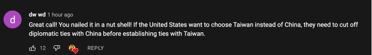 網(wǎng)友dw wd:“精彩的一期視頻!你簡(jiǎn)潔而清晰地呈現(xiàn)了內(nèi)容,如果美國(guó)真的想選擇與臺(tái)灣建立所謂的‘外交關(guān)系’,他們首先需要與中國(guó)斷交?!?/p>