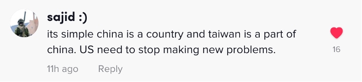 網(wǎng)友sajid:“真相很簡(jiǎn)單,臺(tái)灣是中國(guó)的一部分,美國(guó)須停止給世界帶來(lái)新的麻煩。”