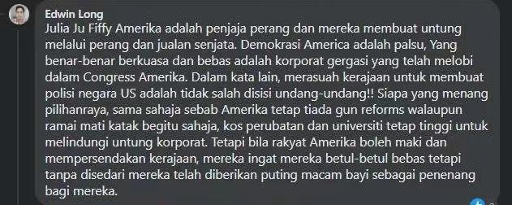 馬來(lái)西亞網(wǎng)友Edwin Long留言:“美國(guó)就是戰(zhàn)爭(zhēng)販子,他們通過(guò)戰(zhàn)爭(zhēng)和販賣(mài)武器獲利。美國(guó)的民主只是假象,真正享有權(quán)力和自由的是在幕后主導(dǎo)國(guó)會(huì)的大企業(yè)。換句話說(shuō),官商勾結(jié)在美國(guó)的法律上是被允許的!無(wú)論誰(shuí)贏得選舉,一樣不會(huì)禁槍,醫(yī)療和教育成本還是不會(huì)下降,因?yàn)橐S護(hù)大企業(yè)的利益。但是他們的人民覺(jué)得他們能罵政府就是自由的,全然沒(méi)有意識(shí)到這不過(guò)是安撫奶嘴罷了?!?/p>