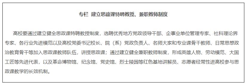 14.建設(shè)專兼結(jié)合的師資隊(duì)伍。各地各校嚴(yán)格按照要求配備建強(qiáng)高校專職思政課教師、輔導(dǎo)員隊(duì)伍,提高中小學(xué)專職思政課教師比例,實(shí)行思政課特聘教授、兼職教師制度,積極聘請(qǐng)黨政領(lǐng)導(dǎo)、科學(xué)家、老同志、先進(jìn)模范等擔(dān)任思政課兼職教師。深入實(shí)施馬克思主義學(xué)院院長(zhǎng)(書記)培養(yǎng)工程,通過集中培養(yǎng)培訓(xùn)、委托重大項(xiàng)目、加強(qiáng)實(shí)踐鍛煉、開展國(guó)際國(guó)內(nèi)訪學(xué)等方式,培養(yǎng)一批青年馬克思主義理論家。