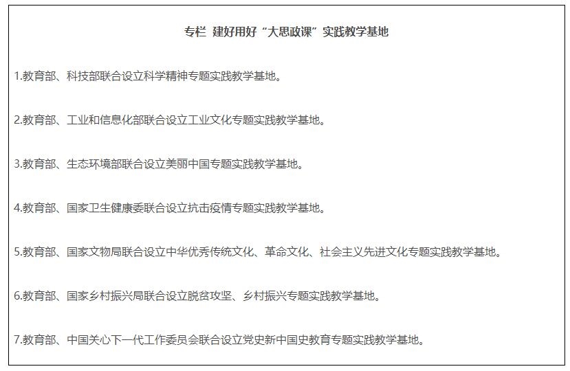 21.強(qiáng)化統(tǒng)籌協(xié)調(diào)。教育部、中央宣傳部做好“大思政課”建設(shè)的總體謀劃。中央網(wǎng)信辦指導(dǎo)做好“大思政課”全媒體宣傳??萍疾?、工業(yè)和信息化部、生態(tài)環(huán)境部、國(guó)家衛(wèi)生健康委、國(guó)家文物局、國(guó)家鄉(xiāng)村振興局、中國(guó)關(guān)心下一代工作委員會(huì)等部門,加強(qiáng)對(duì)基地的指導(dǎo)和建設(shè),切實(shí)發(fā)揮好基地的育人功能。