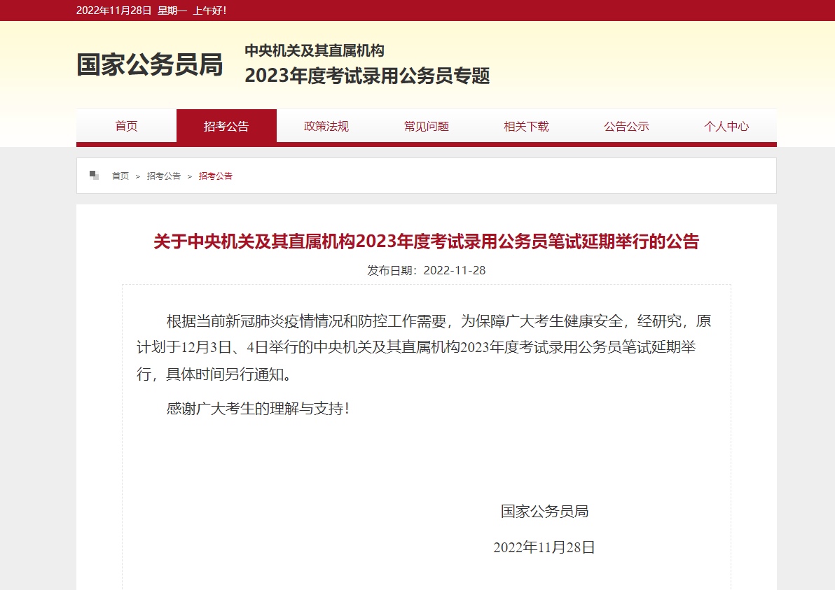 ??根據(jù)當(dāng)前新冠肺炎疫情情況和防控工作需要,為保障廣大考生健康安全,經(jīng)研究,原計劃于12月3日、4日舉行的中央機(jī)關(guān)及其直屬機(jī)構(gòu)2023年度考試錄用公務(wù)員筆試延期舉行,具體時間另行通知。