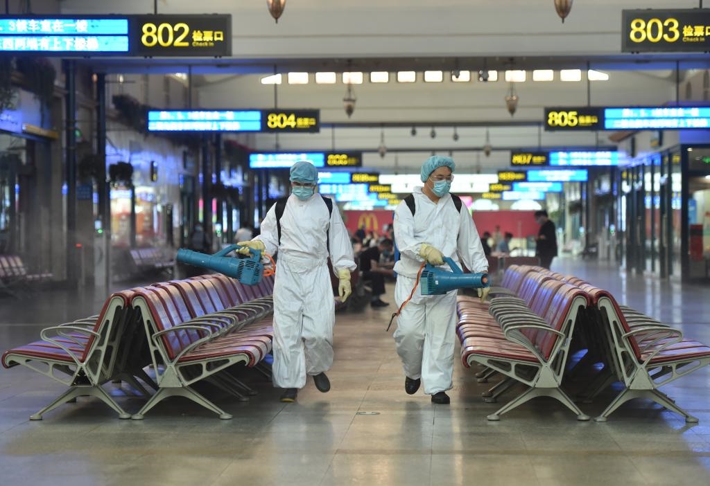 北京站工作人員在候車(chē)大廳進(jìn)行消殺作業(yè)(2020年6月18日攝)。新華社記者 陳鐘昊 攝