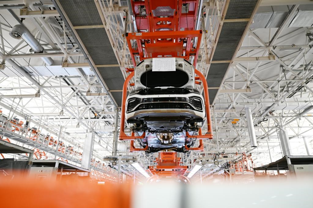 在天津經(jīng)濟(jì)技術(shù)開(kāi)發(fā)區(qū)一汽-大眾華北基地,車(chē)輛在生產(chǎn)線(xiàn)上等待裝配零部件(2022年6月15日攝)。新華社記者 李然 攝