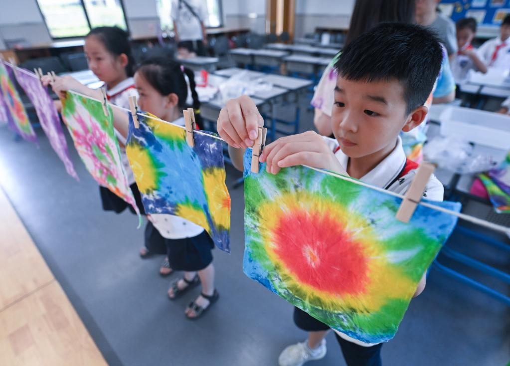 2022年8月10日,湖州市吳興實(shí)驗(yàn)小學(xué)的學(xué)生把做好的扎染作品掛在教室里。新華社記者 徐昱 攝