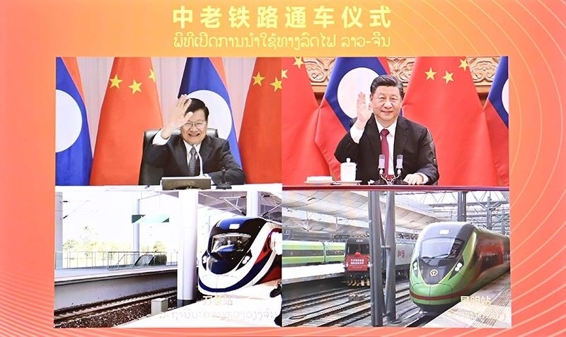 △2021年12月3日,中共中央總書記、國(guó)家主席習(xí)近平在北京同老撾人民革命黨中央總書記、國(guó)家主席通倫通過視頻連線共同出席中老鐵路通車儀式。
