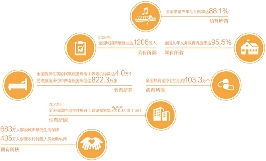 實(shí)實(shí)在在的舉措,帶來了實(shí)實(shí)在在的成效。城鄉(xiāng)學(xué)前教育公共服務(wù)體系基本建成,學(xué)前三年毛入園率由2011年的62.3%提高到2021年的88.1%。堅(jiān)持政府舉辦義務(wù)教育,九年義務(wù)教育鞏固率達(dá)95.5%,初中在校生5120.6萬人,普通小學(xué)在校生10732.0萬人;實(shí)施就業(yè)優(yōu)先戰(zhàn)略,確保就業(yè)局勢總體穩(wěn)定,2022年城鎮(zhèn)新增就業(yè)達(dá)1206萬人,脫貧人口務(wù)工規(guī)模3278萬人,100個(gè)城市公共就業(yè)服務(wù)機(jī)構(gòu)求人倍率為1.46,繼續(xù)保持在1以上,崗位供給大于求職人數(shù);著力解決群眾看病難、看病貴問題,人民健康水平穩(wěn)步提升,全國共有醫(yī)療衛(wèi)生機(jī)構(gòu)103.3萬個(gè),醫(yī)療衛(wèi)生機(jī)構(gòu)床位975萬張,參加基本醫(yī)療保險(xiǎn)人數(shù)達(dá)到134570萬人;不斷推進(jìn)養(yǎng)老事業(yè)和養(yǎng)老產(chǎn)業(yè)協(xié)同發(fā)展,養(yǎng)老服務(wù)體系更加健全,全國提供住宿的民政服務(wù)機(jī)構(gòu)中養(yǎng)老機(jī)構(gòu)達(dá)4.0萬個(gè),民政服務(wù)床位中養(yǎng)老服務(wù)床位達(dá)822.3萬張;加快推進(jìn)住房保障和供應(yīng)體系建設(shè),2022年全年全國各類棚戶區(qū)改造開工134萬套,基本建成181萬套,全國保障性租賃住房開工建設(shè)和籌集265萬套(間),群眾居住條件不斷改善;扎實(shí)做好因疫因?yàn)?zāi)遇困群眾和老弱病殘等特殊群體的基本生活保障,2022年年末,683萬人享受城市最低生活保障,435萬人享受農(nóng)村特困人員救助供養(yǎng),全年臨時(shí)救助1083萬人次,保障網(wǎng)越織越密實(shí)。