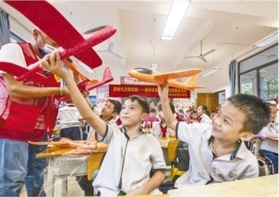 廣西壯族自治區(qū)梧州市的一所小學(xué)內(nèi),學(xué)生正在上趣味航??萍颊n。何華文攝(影像中國)