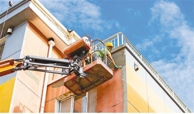 工人在內(nèi)蒙古自治區(qū)呼和浩特市玉泉區(qū)石東路街道一老舊小區(qū)改造升級(jí)現(xiàn)場進(jìn)行外墻真石漆施工作業(yè)。丁根厚攝(人民視覺)