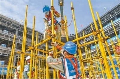 海南省建筑業(yè)職工職業(yè)技能競賽暨質(zhì)量安全現(xiàn)場觀摩交流會(huì)現(xiàn)場,建筑工人正在進(jìn)行架體搭設(shè)競賽。康登淋攝(影像中國)