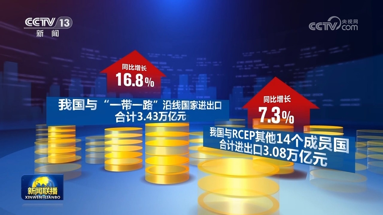 同期,我國與“一帶一路”沿線國家進出口合計3.43萬億元,同比增長16.8%。我國與RCEP其他14個成員國合計進出口3.08萬億元,同比增長7.3%。