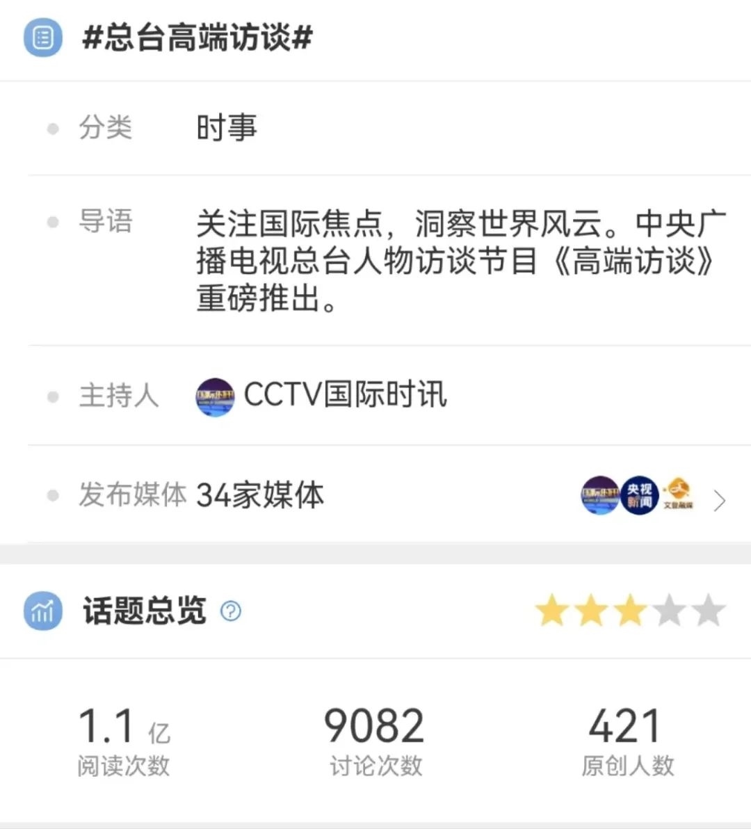 在充分調(diào)研的基礎(chǔ)上,《高端訪(fǎng)談》的采訪(fǎng)敢于碰真問(wèn)題、硬問(wèn)題,緊扣當(dāng)下熱點(diǎn),以觀點(diǎn)鮮明、針對(duì)性強(qiáng)、易于傳播的重磅采訪(fǎng)報(bào)道主動(dòng)設(shè)置議題,奮力提升中國(guó)聲音在國(guó)際輿論場(chǎng)中的話(huà)語(yǔ)權(quán)。