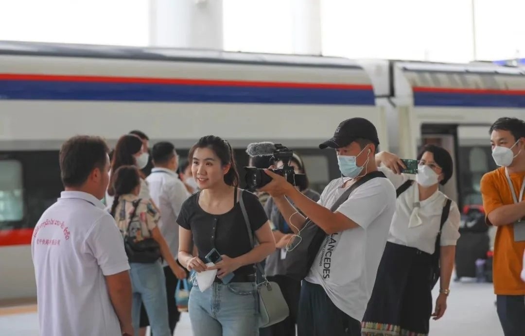 △總臺(tái)主持人鄒韻在中老鐵路“瀾滄號(hào)”動(dòng)車(chē)上采訪(fǎng)